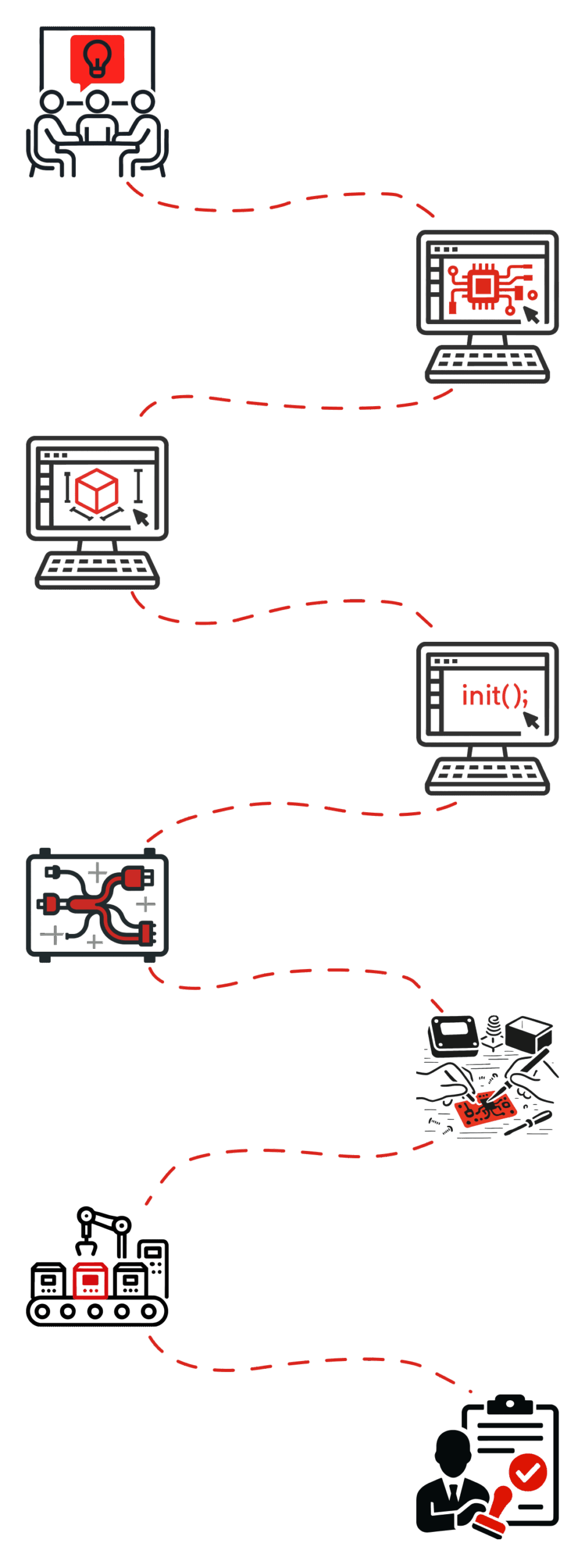 Diese Erfahrungen möchten wir auch bei Ihnen einbringen. Wir begleiten Sie im gesamten Prozess von der ersten Idee bis zum serienreifen Gesamtsystem. Unser Spektrum reicht von Beratung und Konzeptentwicklung über Hard- und Software bis hin zu Prototypen, Serienfertigung und Zertifizierungsbegleitung.